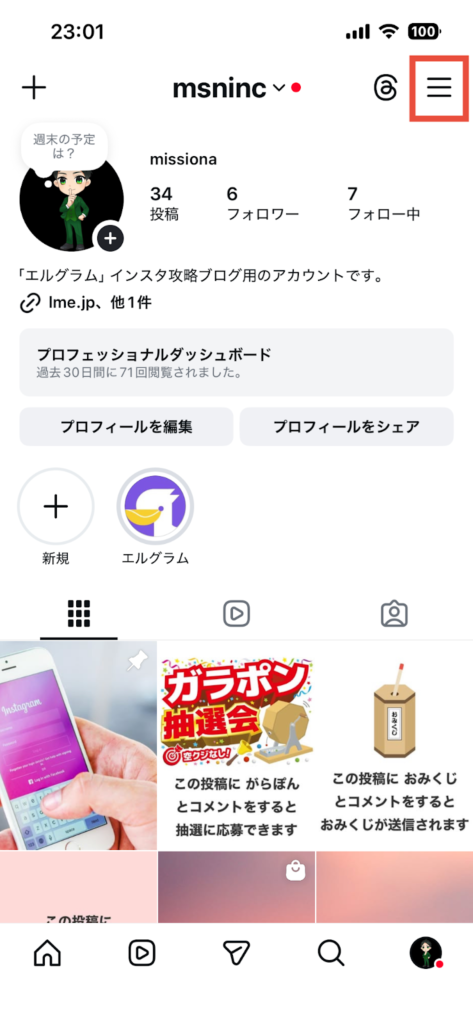 - プロフィール画面をひらき、画面右上の三本線マークをタップする