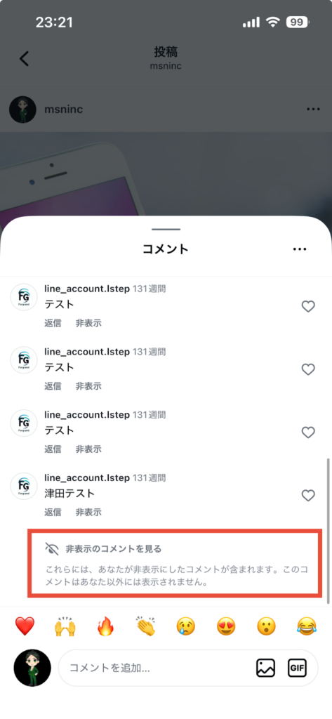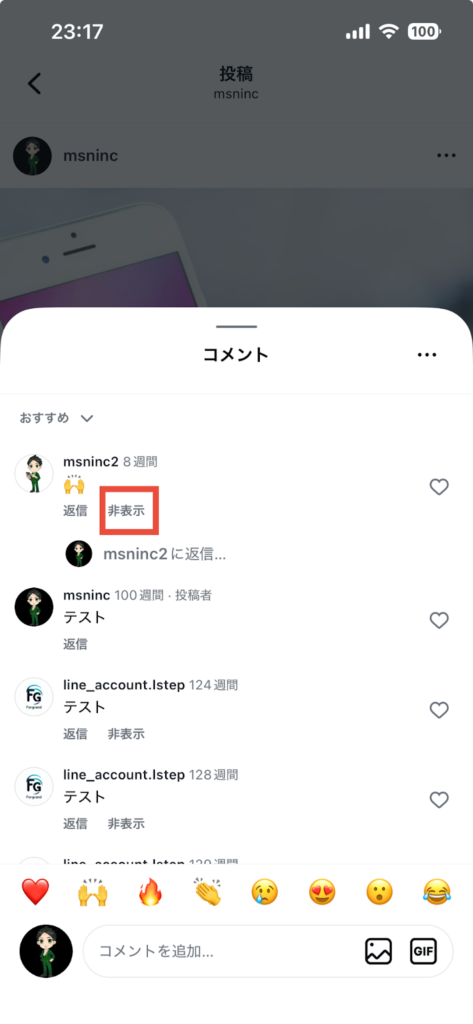 コメント欄をひらき、非表示にしたいコメントに表示される「非表示」をタップして設定しましょう。