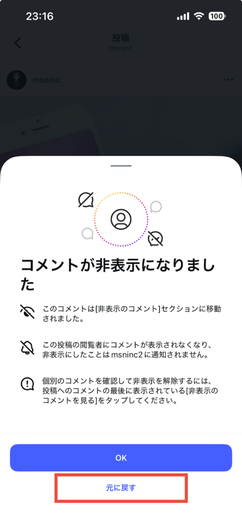 また、投稿についたコメントの一部だけを非表示にすることも可能です。