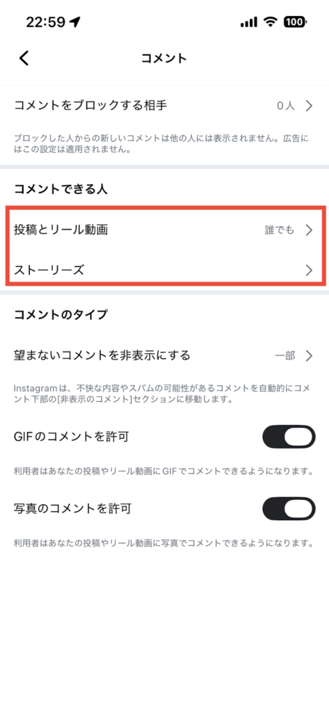- 「投稿とリール動画」、「ストーリーズ」のそれぞれのコメント制限の設定を選択する