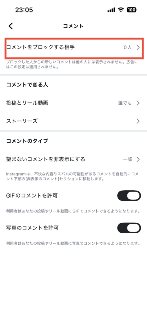 特定のユーザーだけコメントを制限したい場合は、「コメントをブロックする相手」に登録します。