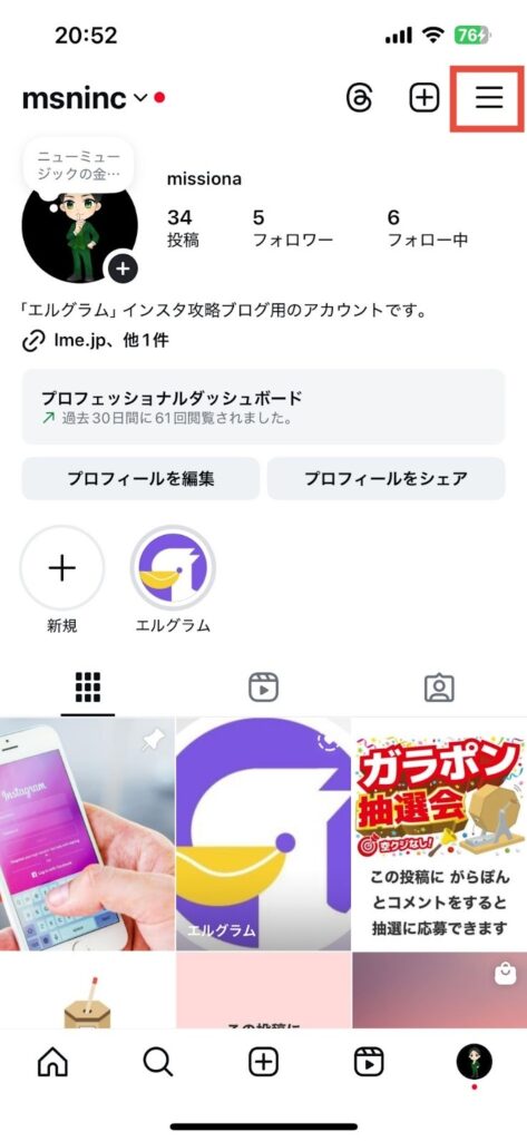 ①Instagramアプリを開き、プロフィール画面右上の三本線マークをタップする