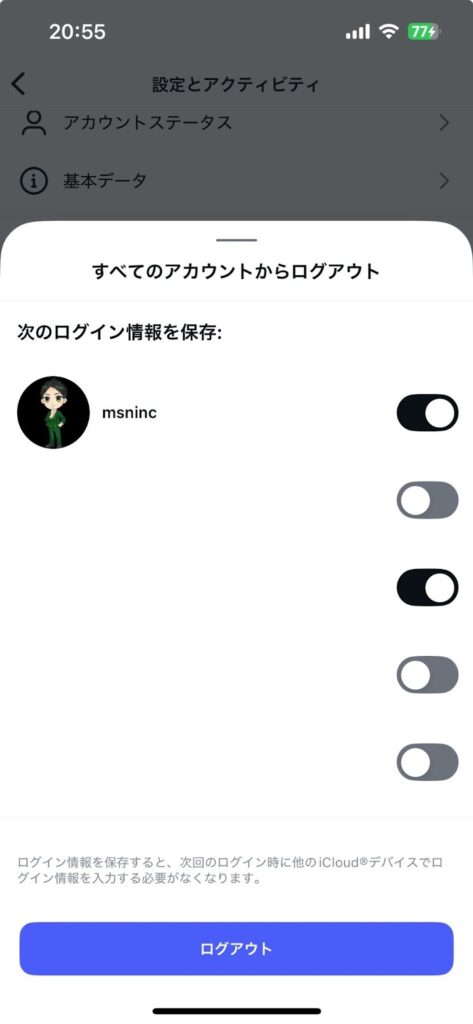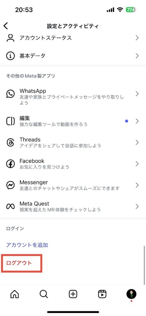 アカウントからのログアウトは、Instagramアプリから簡単に行えます。