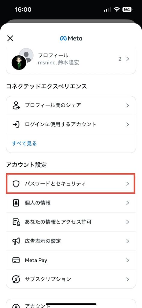 - 「アカウントセンター」をタップする