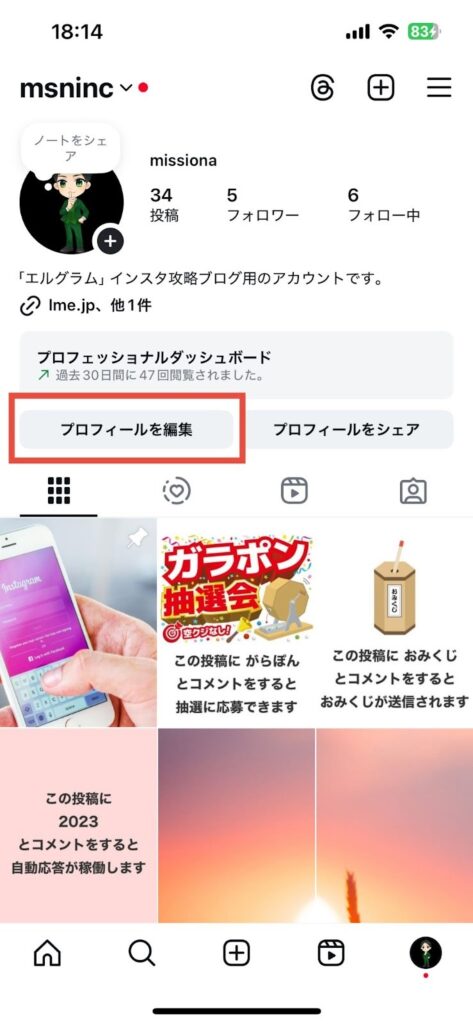 - プロフィール欄下にある「プロフィールを編集」ボタンをタップ