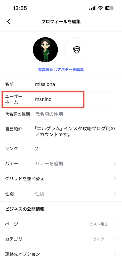 ユーザーネームを変更すると、アカウントURLとQRコードも自動で更新されます。